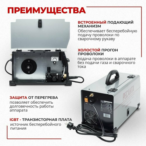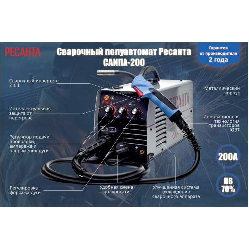 Описание: Сварочный аппарат инверторный полуавтоматический РЕСАНТА САИПА-200 с функцией ММА предназначен для ручной электродуговой сварки постоянным током проволокой в среде защитного газа - углекислого, аргона или их смеси. Применяется для высококачественной сварки низкоуглеродистых сталей, низколегированных и нержавеющих сталей, чугуна и других металлов в строительстве, монтажных и ремонтных работах различной степени сложности. Встроенная защита от перегрева защищает агрегат от поломки. Можно регулировать скорость подачи проволоки и сварочный ток, что позволяет добиться высокого качества сварного соединения.