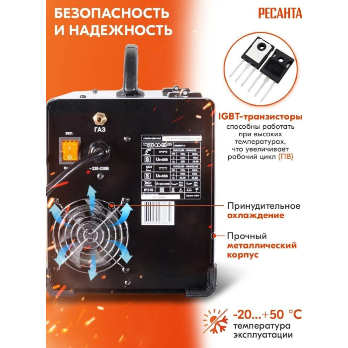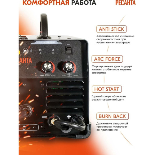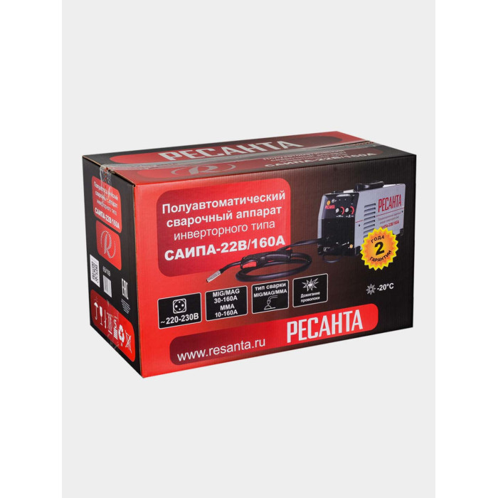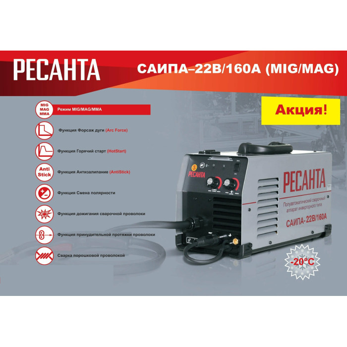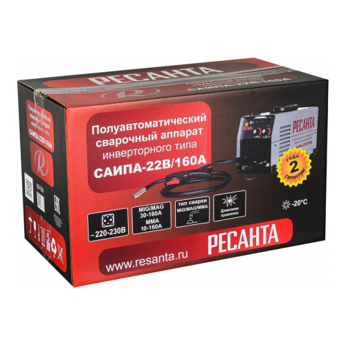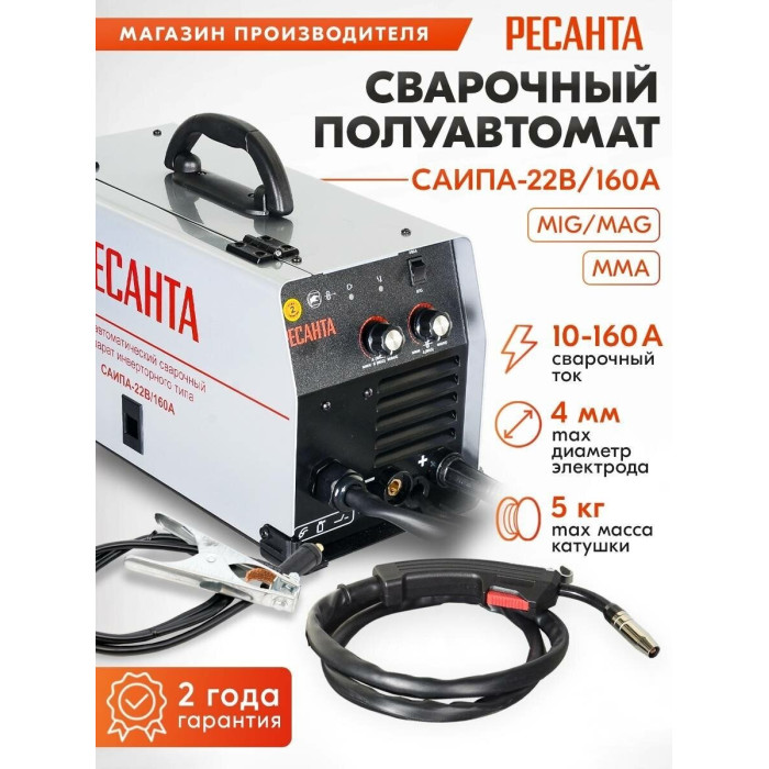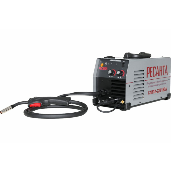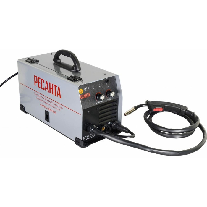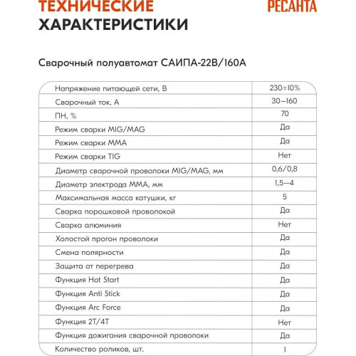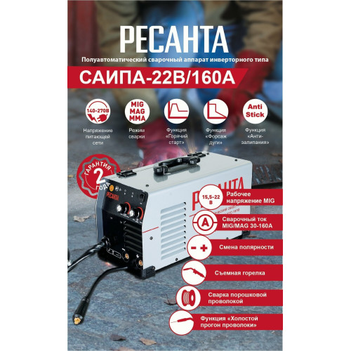 Сварочный полуавтомат Ресанта САИПА-22В/160А (MIG/MAG) – это источник питания инверторного типа, функционирующий на постоянном токе. Он разработан для сваривания движущимся проволочным электродом в аргонной, углекислой среде, либо плавящимся, с рутиловым покрытием – способом ММА (ручная дуговая сварка).
