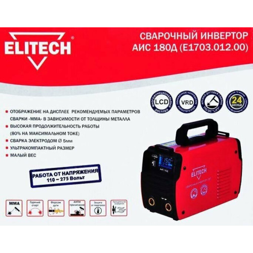 Ручная дуговая сварка (MMA), Аргонодуговая сварка (TIG), тип аппарата: инвертор, дополнительные функции: антиприлипание, горячий старт, форсаж дуги, функция VRD, горячий старт, форсаж дуги, тип тока: постоянный, мощность: 5.40 кВт, диаметр электрода, max: 1.60 мм, диаметр проволоки, max: 4 мм, вес: 3.20 кг, Сварочный ток (MMA), max: 180 А, класс изоляции: H
