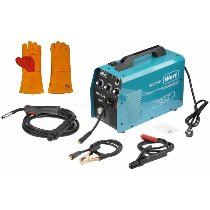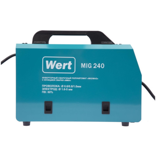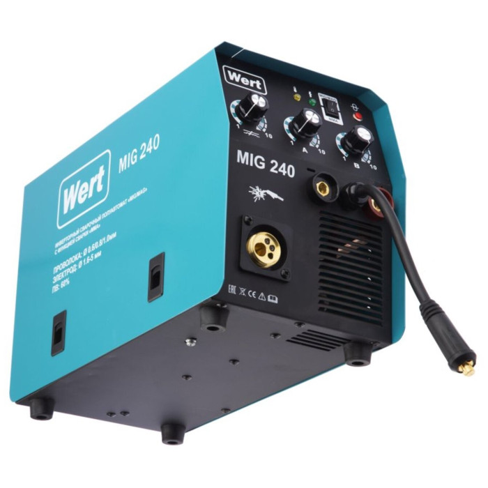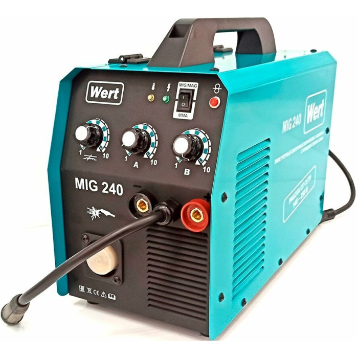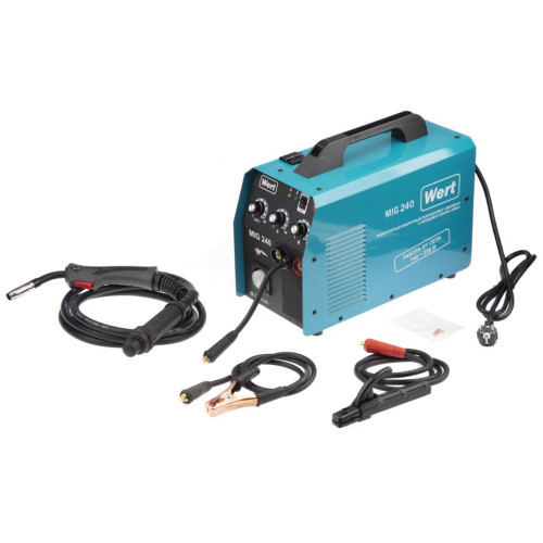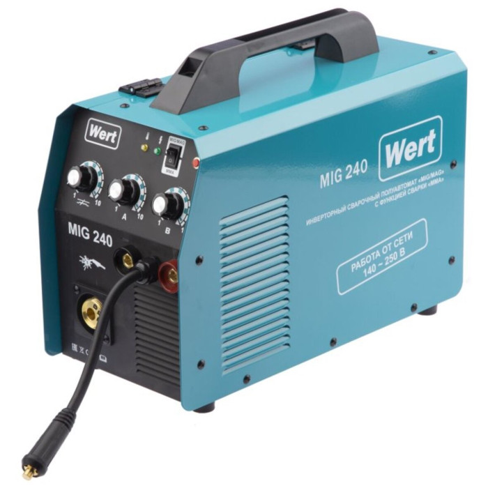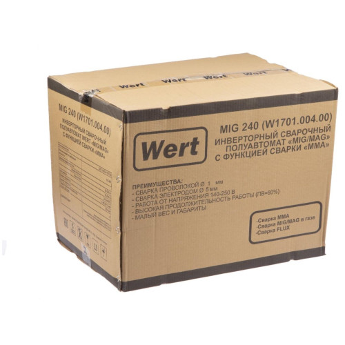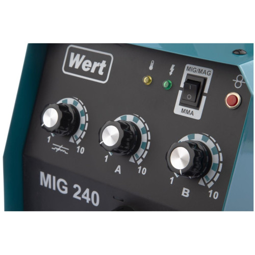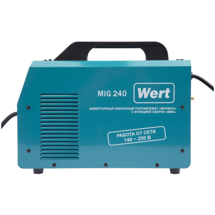 Инверторный полуавтомат WERT MIG 240 (W1701.004.00) создан по самой современной технологии «IGBT» c использованием мощных биполярных транзисторов с изолированным затвором. Плавная регулировка силы тока и напряжения на дуге дают возможность устанавливать наиболее подходящие значения для каждого конкретного случая. Аппарат отличается высоким качеством сварного шва, простотой эксплуатации и удобством обслуживания. Аппарат расчитан на катушку с проволокой до 5кг. Катушка с проволокой устанавливается в специальный отсек внутрь корпуса аппарата. Горелка MIG/MAG съемная с ЕURO коннектором.
