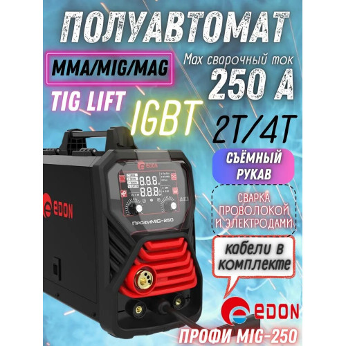 Сварочный полуавтомат, электродержатель, сварочная горелка с рукавом, кабель массы, шланг для газа, краги, 2 ролика 0,8мм и 1 мм, зачистная щетка-молоток, 6 наконечников 0,8 мм и 1 мм, сварочная проволока-2 шт