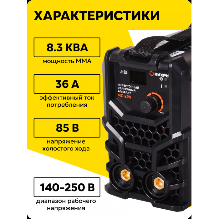 сварочный аппарат «Вихрь», кабель с электрододержателем, кабель с клеммой заземления, паспорт, упаковка