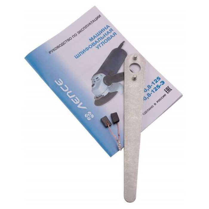 шлифовальная машинка, кожух, дополнительная боковая рукоятка, гайка, фланец, ключ, 2 дополнительные щетки, руководство по эксплуатации