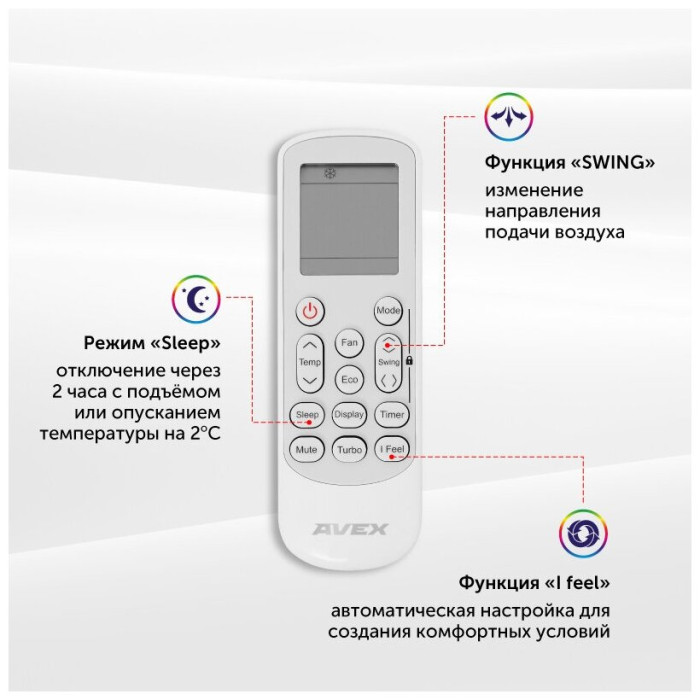 пульт ДУ, регулировка направления воздушного потока, дисплей, таймер включения/выключения
