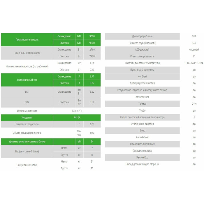 Комплектность внутреннего блока: - Внутренний блок – 1 шт. - Руководство пользователя – 1 шт. - Пульт ДУ – 1 шт. - Элемент питания типа «ААА» – 2 шт. Комплектность внешнего блока: - Внешний блок – 1 шт. - Гофрированная труба – 1 шт. - Медная гайка – 4 шт. - Саморез – 4 шт. - Дюбель – 4 шт. - Дренажный соединитель – 1 шт. - Уплотнительное кольцо – 1 шт.