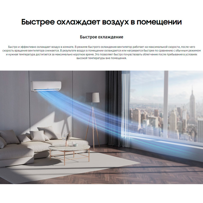 Быстро и эффективно охлаждает воздух в комнате. В режиме быстрого охлаждения вентилятор работает на максимальной скорости, после чего скорость вращения вентилятора снижается. В результате воздух в помещении охлаждается или нагревается быстрее по сравнению с обычным режимом и нужная температура достигается за максимально короткое время. Это позволяет быстро почувствовать облегчение после пребывания в условиях высокой температуры вне помещения.