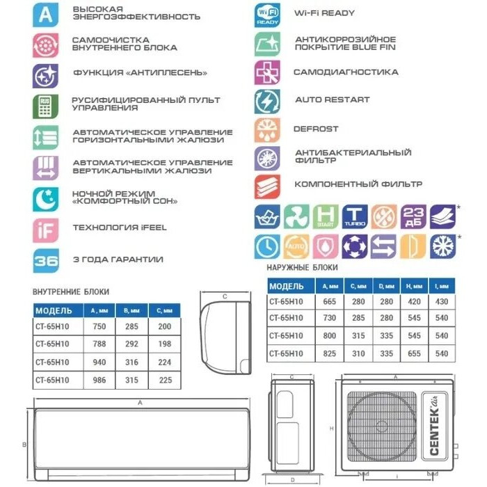Сплит-система Centek CT-65H18 предназначена для использования в помещениях площадью до 56 м². Инновационная система самоочистки «Self-cleaning Plus» обеспечивает комплексную глубокую очистку как внутреннего, так и наружного блока кондиционера. Технология «Progressive inverter» позволяет кондиционеру при работе на минимальных оборотах потреблять всего 45 Ватт. Это существенно уменьшит расходы на электроэнергию. Режим Sleep приносит пользу для здоровья, исключая направленные потоки воздуха, а также предотвращает нерациональный расход электроэнергии в ночное время. В режиме iFeel заданная температура воздуха поддерживается не в месте расположения внутреннего блока (как правило под потолком, где температура значительно выше), а рядом с пультом управления.