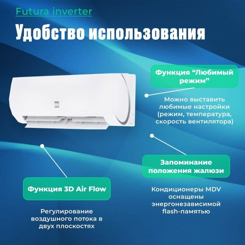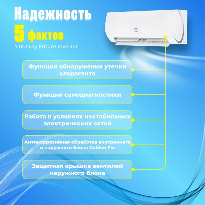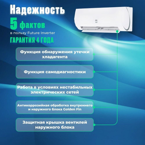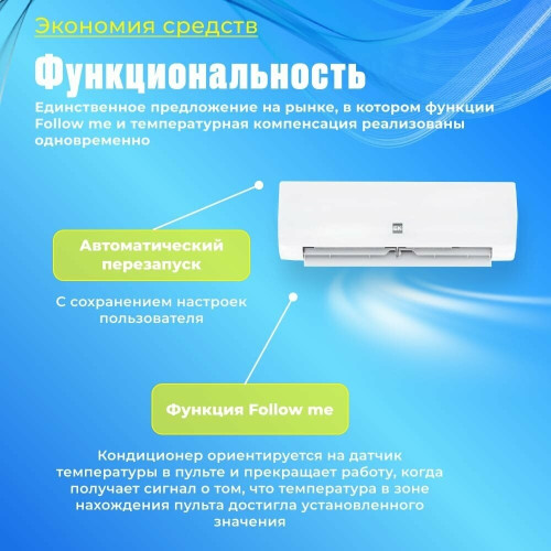 Follow me, автоматическое поддержание температуры, автоперезапуск, ионизация, разморозка внешнего блока, самодиагностика, самоочистка внутреннего блока, система против образования льда, теплый пуск
