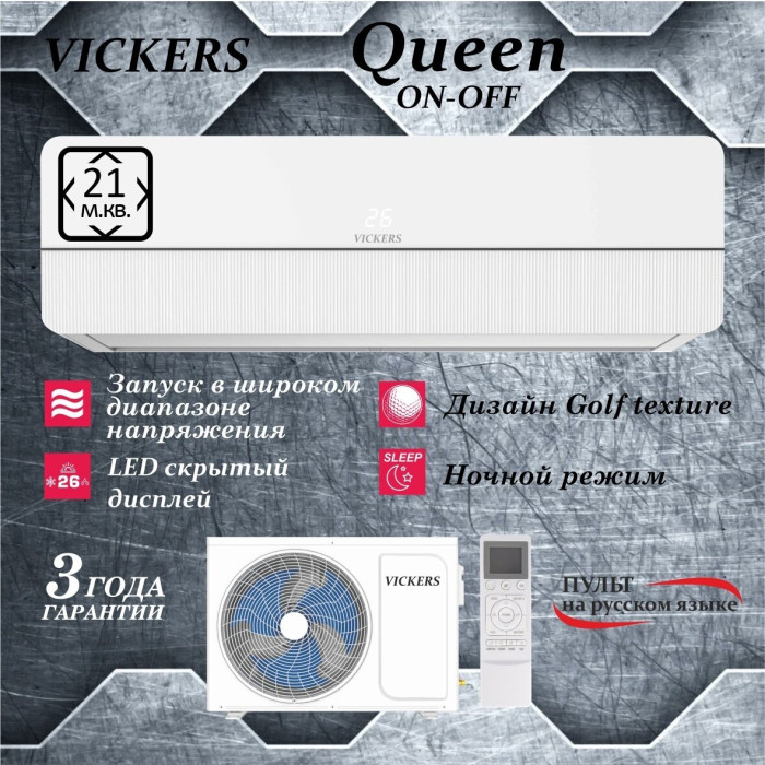 Сплит-система Vickers Queen VC-07HE new on/off — это отличное сочетание цена — качество — функционал (компрессор GMCC, подключение к внутреннему блоку). Внутренний блок - прекрасно впишется в интерьер дома, офиса, квартиры. Классический белый цвет и дизайн Golf texture будут гармонично смотреться в любом помещении площадью 21 м2.