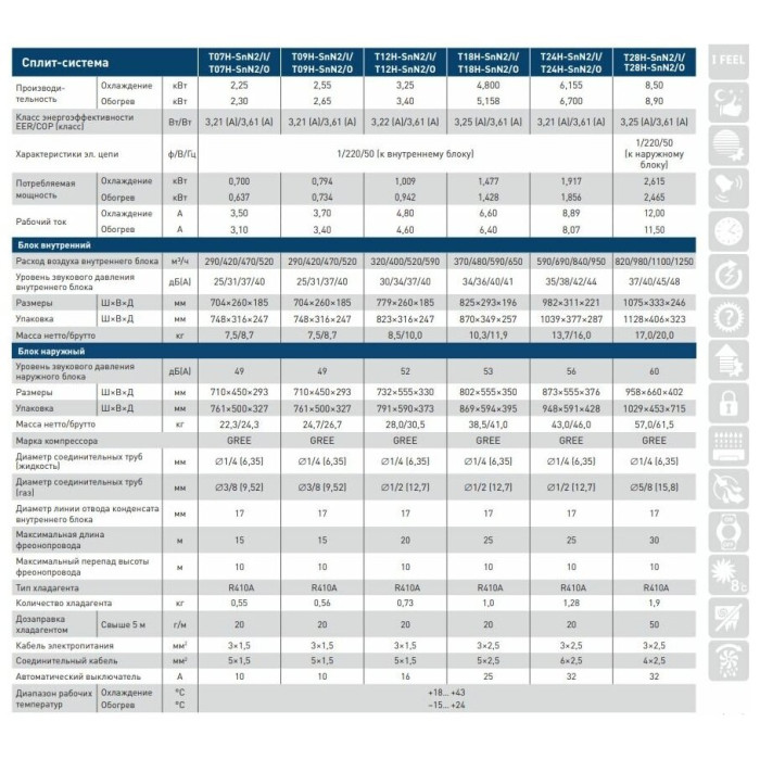 Настенная сплит-система Tosot T24H-SnN2/I/T24H-SnN2/O серии Natal предназначена для создания комфортных климатических условий в домах, квартирах, офисах и других помещениях. Модель оснащена скрытым LED-дисплеем и таймером включения / выключения. Кондиционер не только охлаждает или обогревает воздух, но и позволяет при необходимости эффективно его осушать. Корпус внутреннего блока выполнен из глянцевого пластика. В комплект поставки входит пульт управления YAA1FB. Особенности: Режимы работы: Охлаждение Обогрев Вентиляция Осушение Автоматический Функция I Feel - работа кондиционера по датчику температуры, расположенному в пульте ДУ Двойные горизонтальные жалюзи Регулировка положения жалюзи для изменения направления подачи воздуха Автосвинг - автоматическое покачивание жалюзи для равномерного распределения воздушного потока Режим комфотного сна Режим Turbo Поддержание температуры в помещении на уровне 8°C в режиме обогрева для предотвращения его обмерзания Предварительный подогрев воздуха перед запуском вентилятора (в режиме обогрева) Функция блокировки пульта управления Авторестарт - возобновление работы в прежнем режиме после перерыва в подаче питания Система самодиагностики с отображением кода ошибки на дисплее внутреннего блока Возможность установки различных типов воздушних фильтров во внутренний блок Программа эффективного оттаивания - запускается при наличии наледи на внешнем блоке и работает до ее исчезновения Функция самоочистки Удобное расположение системы фильтров в верхней части внутреннего блока позволяет производить их очистку без вскрытия Увеличенная прочность наружного блока Роторный компрессор GREE Сторона подключения электропитания: внутренний блок Дополнительные характеристики: Диапазон настройки температуры в помещении: от 16 до 30 °C Коэффициент энергоэффективности / класс: EER: 3,21 / А COP: 3,61 / А Рабочий ток: Охлаждение: 8,89 А Обогрев: 8,07 А Рабочий диапазон температур наружного воздуха: Охлаждение: от 18 до 43 °C Обогрев: от -15 до 24 °C Уровень звукового давления внутреннего блока: 35 / 38 / 42 / 44 дБ(А) Трубопровод: Максимальная длина трассы: 25 м Максимальный перепад высот между блоками: 10 м Диаметр труб: Жидкость: 6,35 мм (1/4" Газ: 12,7 мм (1/2" Дренаж: 17 мм Заводская заправка хладагента: 1,28 кг Дополнительная заправка хладагента, при трассе более 5 м: 20 г/м Кабели: Электропитание: 3х2,5 мм2 Соединительный: 6х2,5 мм2 Автомат защиты: 32 А Габариты в упаковке: Внутренний блок: 1039х287х377 мм Внешний блок: 948х428х591 мм Вес с упаковкой: Внутренний блок: 16 кг Внешний блок: 46 кг Опции (заказываются отдельно): Установка низкотемпературного комплекта до -30 / -43 °C Фильтр с ионами серебра Фильтр с катализатором LTC Угольный фильтр Антибактериальный фильтр Катехиновый фильтр Фотокаталитический фильтр Электростатический фильтр Внимание! На фото аналогичная модель другого размера.