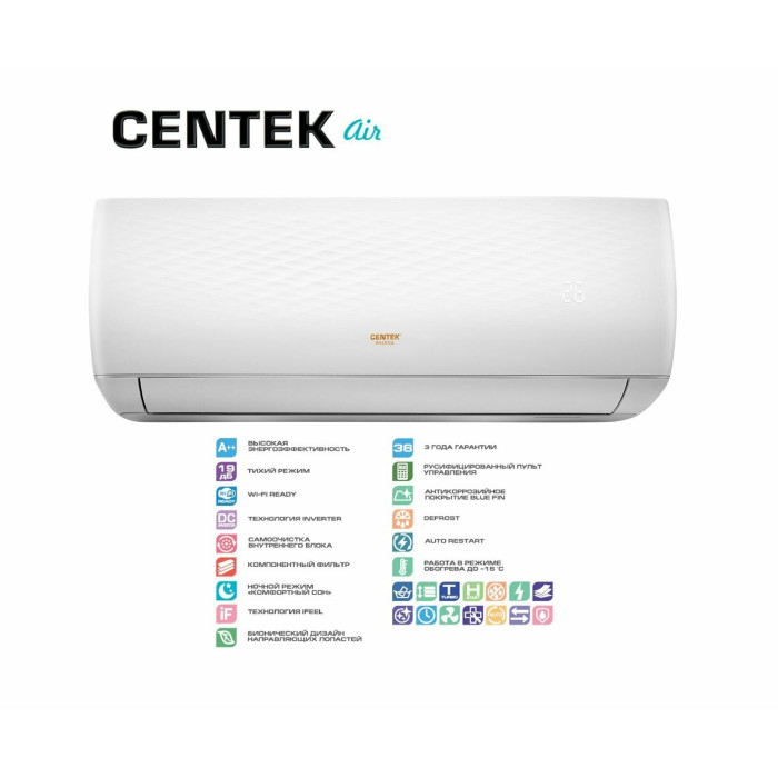 Сплит-система инверторного типа Centek CT-65V сочетает в себе уникальные технологии и высокую эффективность работы. В числе технических плюсов модели - большое количество дополнительных опций, упрощающих процесс эксплуатации, а также несколько доступных режимов работы.