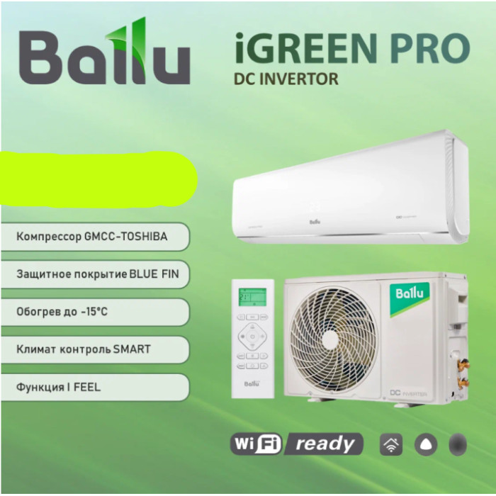 Кондиционер Ballu BSAGI-07HN8 iGreen Pro DC Inverter - инверторный кондиционер, предназначенный для охлаждения и обогрева помещений до 20 м². Дизайнерский внутренний блок глянцевый, выполнен в классическом белом цвете, с закруглёнными боковинами и перфорированными вставками серого цвета. В центре внутреннего блока расположен скрытый дисплей «Mirage», на который выводится заданная температура. Жалюзи внутреннего блока модели регулируются по горизонтали и вертикали с пульта. Пульт кондиционера Ballu BSAGI-07HN8 имеет удобное расположение кнопок, зеленую подсветкой с возможностью отключения, и функцию «iFeel», благодаря которой температура измеряется в зоне его нахождения. Кондиционер поставляется без Wi-Fi модуля, который позволяет управлять прибором через мобильное приложение «HOMMYN» или голосовые помощники «Алиса», «Маруся» и «Салют». Кондиционер оснащен функцией самоочистки, при которой, поверхность испарителя внутреннего блока замораживается, и размораживается, а вся грязь удаляется через дренажный шланг. После процедуры самоочистки, включается режим стерилизации, при которой теплообменник нагревается до 56ºС, что способствует его стерилизации от вирусов и бактерий. Кондиционер Ballu BSAGI-07HN8 оснащен надежным компрессором GMCC (Toshiba), который дополнительно защищен тепло и шумоизоляцией. Модель имеет высокий класс энергоэффективности «А», при работе в режимах охлаждения и обогрева. Преимущества кондиционера Баллу BSAGI-07HN8 iGreen Pro DC Inverter: • 4 режима работы: охлаждение I обогрев I вентиляция I осушение • Управление жалюзи по горизонтали и вертикали с пульта • Wi-Fi модуль докупается отдельно.• Управление через помощники «Алиса» и «Маруся» • Пульт управления с подсветкой и функций iFeel • 5 скоростей вентилятора внутреннего блока • Защита от перепадов и скачков напряжения • Функция самоочистки и стерилизации • 24 часовой таймер и функция Restart • Работа в режиме обогрева до -15 ºС • Функция «Дежурный обогрев 43;8 ºС» • Покрытие теплообменника Blue Fin.