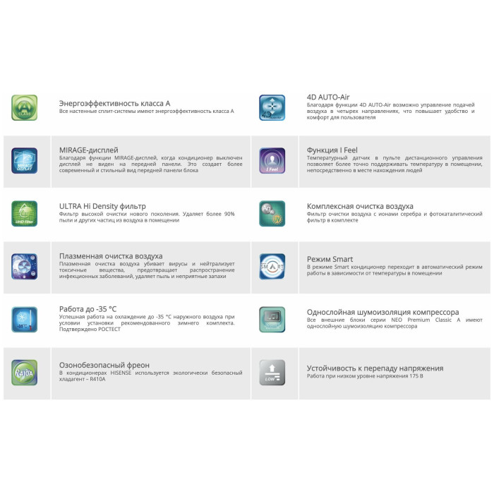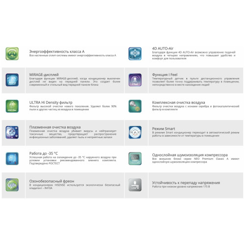 рабочие температурные границы,(охлаждение): +21 - +43°С; рабочие температурные границы (нагрев): -10 - +24°С; максимальный перепад по высоте между внутренним и наружным блоками: 8 м; диаметр дренажа: 18 мм; диаметр жидкостной трубы, мм (дюйм): 6.35 (1/4’’); диаметр газовой трубы, мм (дюйм): 9.53 (3/8’’); двойная шумоизоляция компрессора; индикация утечки хладагента; функция I FEEL; управление по WI-FI (опционально); уровень шума наружного блока 50.5 дБ