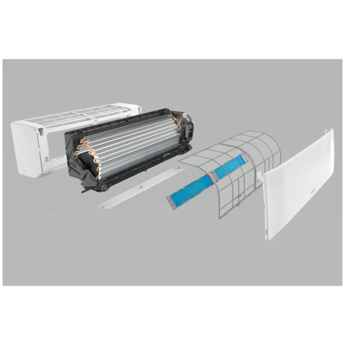 управление горизонтальной жалюзи с пульта ДУ, режим дежурного отопления, режим очистки теплообменника внутреннего блока замораживанием "Frost Wash"; уровень шума внешнего блока (макс) - 46 дБ; регулировка скорости вращения вентилятора (5 скоростей); сезонная энергоэффективность SEER/SCOP: A++/7.5 / A++/4.6, низкий уровень шума от 20 дб(А), горизонтальная автожалюзи, продвинутый пульт с большим дисплеем с подсветкой, высокоинформативный модуль индикации, дополнительные антивирусные фильтры с пиритионом цинка в комплекте; минимальная температура для эксплуатации кондиционера в режиме обогрева -15°C