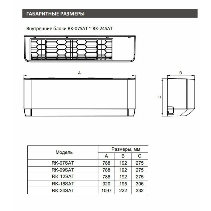 Размеры внутреннего блока сплит-системы или мобильного кондицион