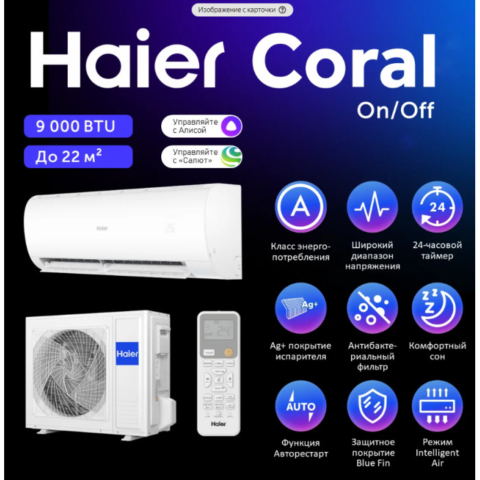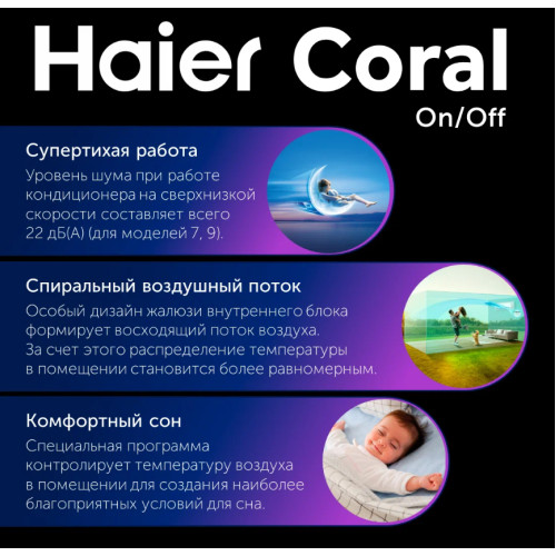Комфортный сон автоматический контроль температуры в помещении Blue Fin антикоррозийное покрытие теплообменников наружного и внутреннего блоков 24-часовой таймер поддержание параметров воздуха в помещении Spiral Air восходящий воздушный поток обеспечивает максимальный комфорт Wi-Fi evo Wi-Fi evo регулировка скорости вентилятора 2 фильтра 3 в 1 здоровый и чистый воздух Спиральный воздушный поток Благодаря восходящему воздушному потоку воздух не попадает на человека, а распределение температуры в помещении становится более равномерным. Wi-Fi управление (evo) Новая IoT экосистема evo от Haier позволяет удаленно управлять по Wi-Fi кондиционерами и другой совместимой бытовой техникой Haier. Управление осуществляется через мобильное приложение evo. Комфортный сон Специальная программа контролирует температуру воздуха в помещении для создания наиболее благоприятных условий для сна. Общие спецификации: Охлаждение (Вт): 2100 Уровень звукового давления [дБ(А)] (Выс/Ср/Низ/Сверх): 36 / 33 / 31 / 22 Энергоэффективность: A / A Тип двигателя: Не инвертор Площадь, м²: 13 – 20 Производительность: EER/COP (Среднее значение): 3.22 / 3.63 Электропитание (Ф/В/Гц): 1 / 230 / 50 Потребляемая мощность охлаждение (Вт): 650 Потребляемая мощность нагрев (Вт) 605 Обработка воздуха: Расход воздуха (м3/ч): 400 Установка: Диаметр жидкостной линии (мм): 6.35 (1/4) Диаметр газовой линии (мм): 9.52 (3/8) Максимальная длина трассы (м): 15 Максимальный перепад высот трассы (м): 10 Внутренний блок: Габаритные размеры без упаковки (Ш x Г x В) (мм): 700 x 190 x 265 Габаритные размеры в упаковке (Ш x Г x В) (мм): 771 x 273 x 341 Чистый вес (кг): 7.1 Вес в упаковке (кг): 8.9 Наружный блок: Габаритные размеры без упаковки (Ш x Г x В) (мм): 696 x 256 x 432 Габаритные размеры в упаковке (Ш x Г x В) (мм): 807 x 314 x 485 Производитель компрессора: Rechi Чистый вес (кг): 20.9 Уровень звукового давления, (Выс. Скорость), дБ(А): 49 Дополнительные характеристики: Диапазон рабочих температур (Нагрев): -7…24°C Диапазон рабочих температур (Охлаждение): 18…43°C