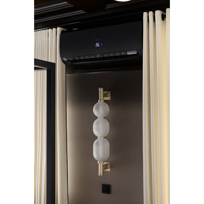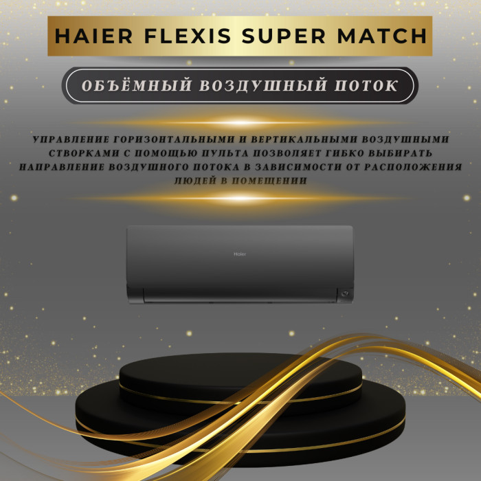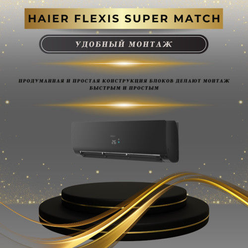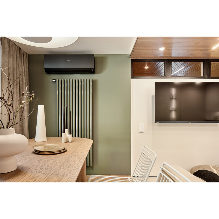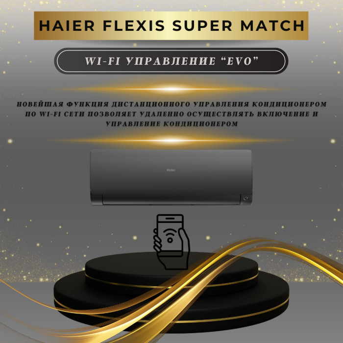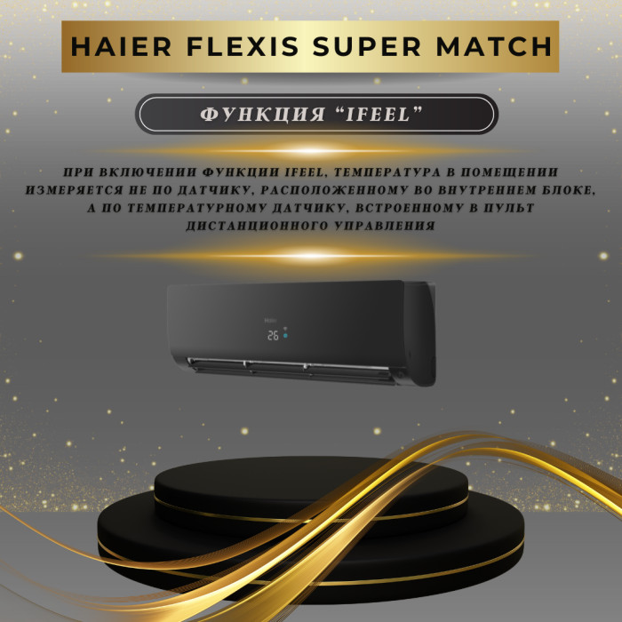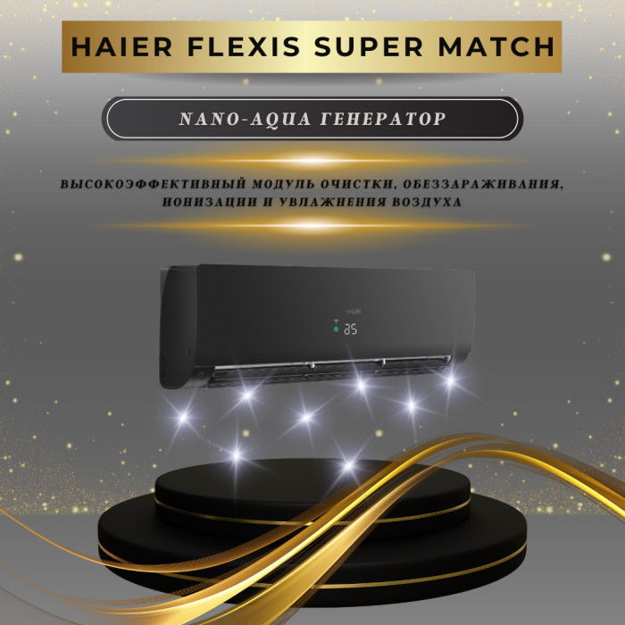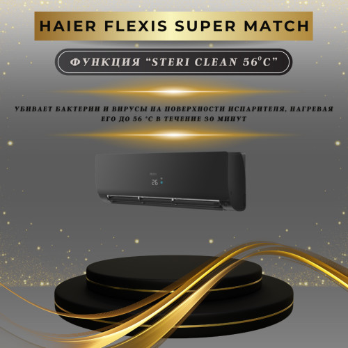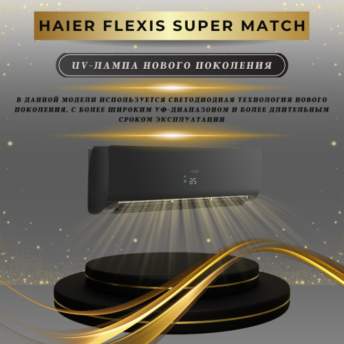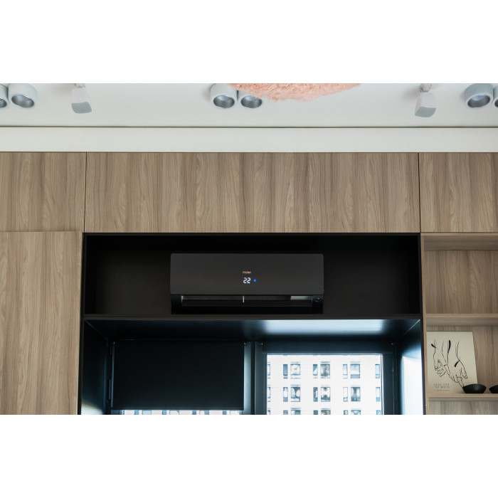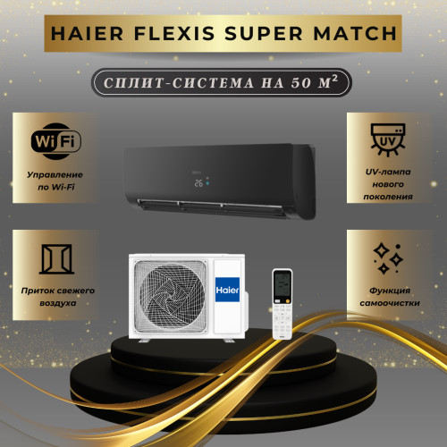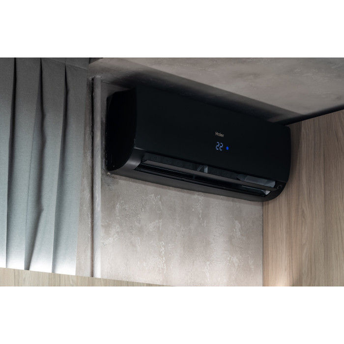 Кондиционер сплит-система Haier AS50S2SF2FA-B: Кондиционеры серии Flexis сочетают в себе широкую функциональность и премиальный дизайн. Сплит-системы серии Flexis отлично подойдут для создания комфортного климата в квартире, частном доме или офисе летом, в межсезонье и даже зимой. Кондиционеры этой серии работают в режиме обогрева до −20С. Внутренние блоки представлены в белом, матовом черном и золотом (шампань) цветах. Отличительными особенностями этой серии являются функция стерилизации теплообменника Steri Clean 56C, убивающая до 99% бактерий и микробов, и новая LED УФ-лампа. Flexis совместим с новой IoT экосистемой Haier и может удаленно управляться по Wi-Fi через мобильное приложение. Wi-Fi управление (evo): Новая IoT экосистема evo от Haier позволяет удаленно управлять по Wi-Fi кондиционерами и другой совместимой бытовой техникой Haier. Управление осуществляется через мобильное приложение evo. Самоочистка внутреннего блока SelfClean: Новейшая технология очистки теплообменника позволяет удалять грязь, бактерии, микробы и другие микроорганизмы c поверхности теплообменника, используя процесс теплового расширения оттайки. Мощная УФ-лампа: Мощная УФ-Лампа осуществляет фотохимическую обработку воздуха, его эффективное обеззараживание, нейтрализацию вирусов и бактерий. Стерилизация испарителя: Теплообменник принудительно осушается, и с помощью интеллектуального контроля температуры и регулировки частоты вращения вентилятора, температура на теплообменнике достигает 56°С и сохраняется в течение 30 минут после активации. Экодатчик: Датчик присутствия регистрирует наличие в помещении людей и их перемещения, и корректирует работу кондиционера для достижения наиболее комфортных условий и экономии электроэнергии. Основные характеристики: Тип: сплит-система Тип кондиционера: настенная сплит-система Тип управления мощностью: инверторный Показатель мощности BTU: 18000 Максимальная площадь помещения: 50 м² Максимальный воздушный поток: 900 м3/ч Производительность в режиме охлаждения: 5200 Вт Производительность в режиме обогрева: 6000 Вт Потребляемая мощность, охлаждение: 1440 Вт Потребляемая мощность, обогрев: 1500 Вт Уровень шума внешнего блока: 50 дБ Уровень шума внутреннего блока: 28 дБ Тип хладагента: R32 Класс энергопотребления: А++ Максимальная длина: 25 м Максимальный перепад высот: 15 м Диапазон рабочих температур: -20…24°C/-20…43°C Цвет: черный Режимы и функции: Основные режимы: обогрев, осушение, охлаждение Ионизатор воздуха Самоочистка внут блока Авторестарт Самодиагностика Wi-Fi Непрерывное движение заслонок Пульт Д/У Ночной режим Авто режим Сенсор движения Голосовой помощник Алиса Скрытый дисплей Ультрафиолетовая лампа Эко датчик "Умный глаз" Индикация работы: да Фильтры: Антибактериальный фильтр Фильтр предварительной очистки Фильтр тонкой очистки Габариты и вес: Габариты внутреннего блока: 32.3х99.9х22.5 см Габариты внешнего блока: 64.3х89х32.9 см Вес внутреннего блока: 12 кг Вес внешнего блока: 36.5 кг
