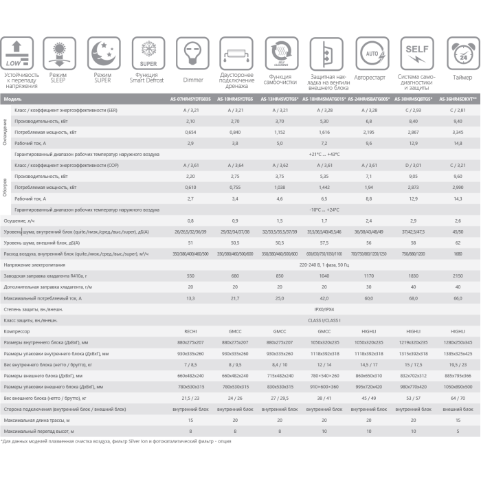 MIRAGE-дисплей, 4D AUTO Air – вертикальные и горизонтальные автожалюзи, таймер, функция I Feel, режимы Sleep, Smart, Super, Ultra Hi Density фильтр; подготовлен к подключению Wi-Fi модуля (Wi-Fi - опция); уровень шума внутреннего блока 32 дБ; уровень шума наружного блока 50.5 дБ; диапазон температур при охлаждении: +21 +43 °С, при обогреве: -10 +24 °С