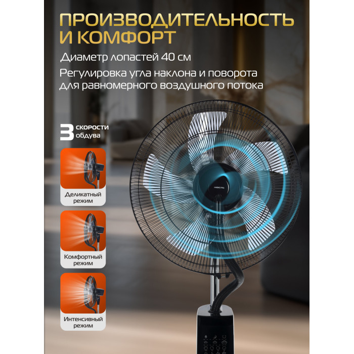 тип: напольный, площадь помещения: 25 м², рабочий механизм: осевой, мощность: 90 Вт, питание: от сети, управление: электронное, дополнительные функции: регулировка наклона, регулировка поворота, регулировка высоты, особенности: таймер, увлажнитель, пульт ДУ, диаметр лопастей: 40 см, уровень шума: 53 дБ