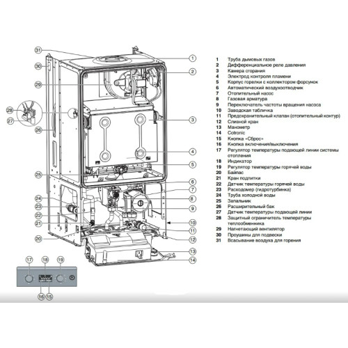 воздухоотводчик, встроенный расширительный бак, манометр, предохранительный клапан, разъем для подключения внешнего управления, термометр