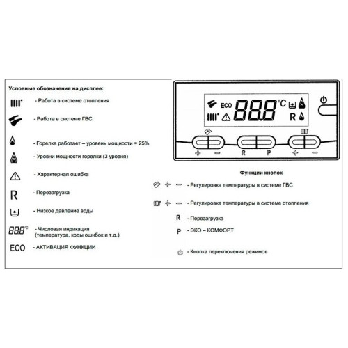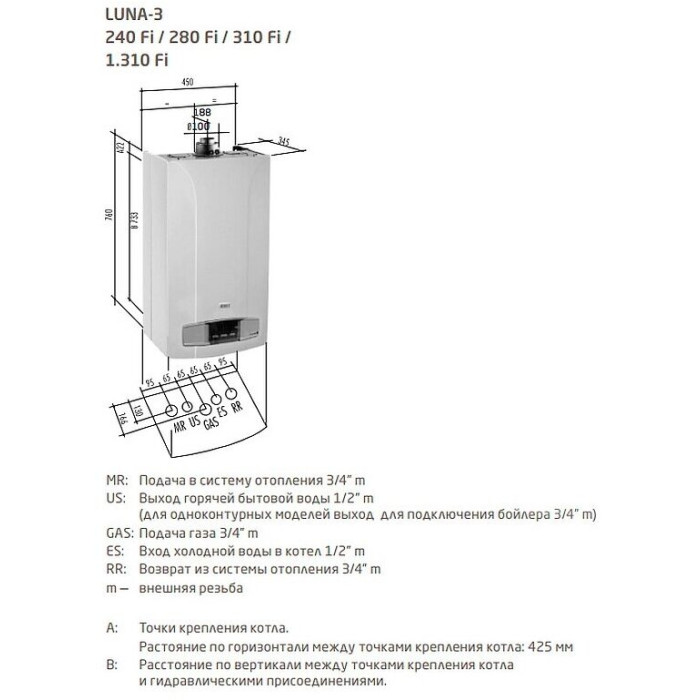 Высокопроизводительные котлы третьего поколения обеспечивают максимальный комфорт под вашим управлением. Передовая электронная плата, самодиагностика и возможность недельного программирования гарантируют высокую надежность работы котла, а также простоту использования и обслуживания. Котлы Luna-3 оборудованы широким жидкокристаллическим дисплеем, на котором отображается вся информация о работе котла. Газовая Система Непрерывная электронная модуляция пламени в режимах отопления и Гвс; Котлы адаптированы к российским условиям. Устойчиво работают при понижении входного давления природного газа до 5 мбар; Рассекатели пламени на горелке сделаны из нержа веющей стали; Возможна перенастройка для работы на сжиженном газе. Гидравлическая Система Турбинный датчик протока горячей воды (расходомер); Энергосберегающий циркуляционный насос с автоматическим воздухоотводчиком; Первичный медный теплообменник, покрытый специальным составом для дополнительной защиты от коррозии; Вторичный пластинчатый теплообменник из нержавеющей стали; Латунный трехходовой клапан с электрическим сервоприводом (в двухконтурных моделях); Манометр; Автоматический байпас; Постциркуляция насоса; Фильтр на входе холодной воды; Встроенный трехходовой клапан для бойлера (без сервопривода) в одноконтурных моделях. Температурный Контроль Два диапазона регулирования температуры в системе отопления: 30 — 85°С и 30 — 45°С (режим «теплые полы»); Встроенная погодозависимая автоматика; Регулирование и автоматическое поддержание заданной температуры в контурах отопления и Гвс; Цифровая индикация температуры; Возможность подключения комнатного термостата. Устройства Контроля И Безопасности Жидкокристаллический дисплей; Электронная система самодиагностики и запоминание последних ошибок в работе; Возможность вывода сигнала о блокировке котла на пульт диспетчера; Ионизационный контроль пламени; Системы защиты от блокировки насоса и трехходового клапана (включаются автоматически каждые 24 ч); Защитный термостат от перегрева теплоносителя в первичном теплообменнике; Датчик тяги для контроля за безопасным удалением продуктов сгорания (пневмореле — для моделей с закрытой камерой сгорания, термостат — для моделей с открытой камерой); Прессостат в системе отопления — срабатывает при недостатке давления теплоносителя; Предохранительный клапан в контуре отопления (3 атм.); Система защиты от замерзания в контурах отопления и Гвс. Информация с сайта производителя Характеристики: Тип: газовый Тип котла: газовый Вид топлива: газ Площадь обогрева: 310 м2 Способ установки: настенный Камера сгорания: закрытая Материал теплообменника: медь Количество контуров: 1 контур (отопление) Диаметр подключения контура отопления: 3/4 дюйма Максимальная температура в контуре ГВС: 80 ° Циркуляционный насос: есть Расширительный бак: есть Объем расширительного бака: 10 л Энергонезависимый: нет КПД: 93.1 % Мощность: 31 Вт Диаметр дымохода: 60/100 мм Диаметр подключения газа: 3/4 дюйма Номинальное давление газа: 20 мбар Минимальное давление газа: 13 мбар Высота: 763 мм Ширина: 450 мм Глубина: 345 мм Страна производитель: Италия Гарантия: 24 мес EAN: 8022945010106 Вес: 40 кг