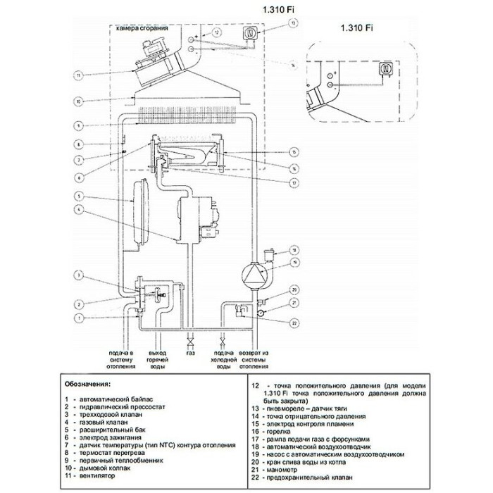воздухоотводчик, встроенный расширительный бак, встроенный циркуляционный насос, манометр, предохранительный клапан, разъем для подключения внешнего управления, термометр, фильтр для воды